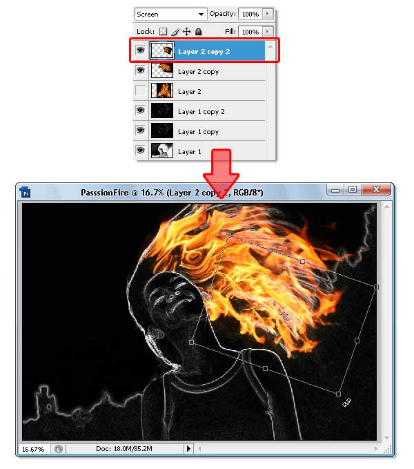 Click the "Layer 2 copy" to make it active, then use the Free Transform command ( Edit > Free Transform) to rotate and resize the fire image like shown below. Don’t forget to press Enter when you’re done transforming.